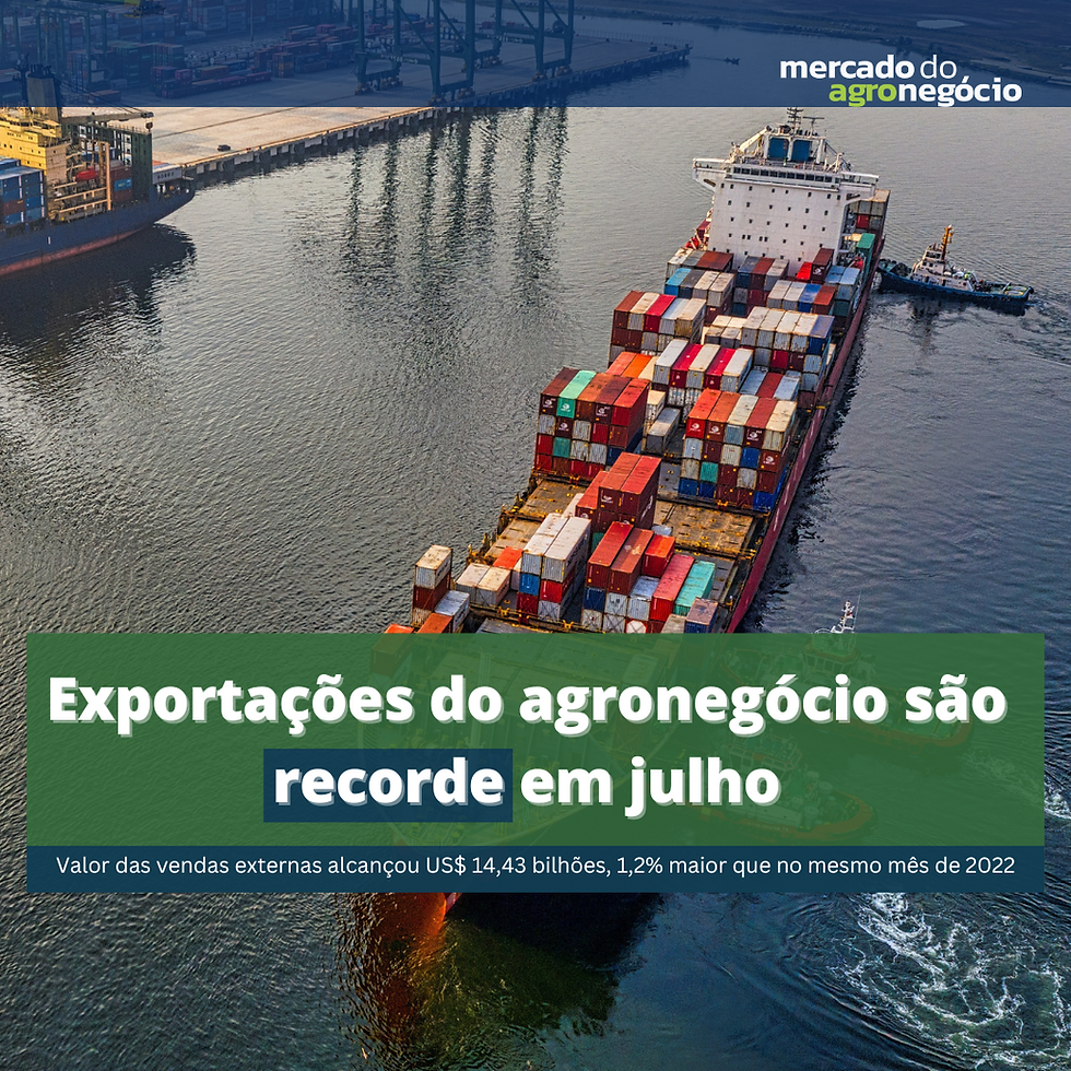 O Ministério da Agricultura e Pecuária informou nesta quinta-feira (10/08) que as exportações brasileiras de produtos do agronegócio alcançaram, em julho deste ano, o valor recorde de US$ 14,43 bilhões. O valor é 1,2% maior em relação ao registrado no mesmo mês do ano passado.